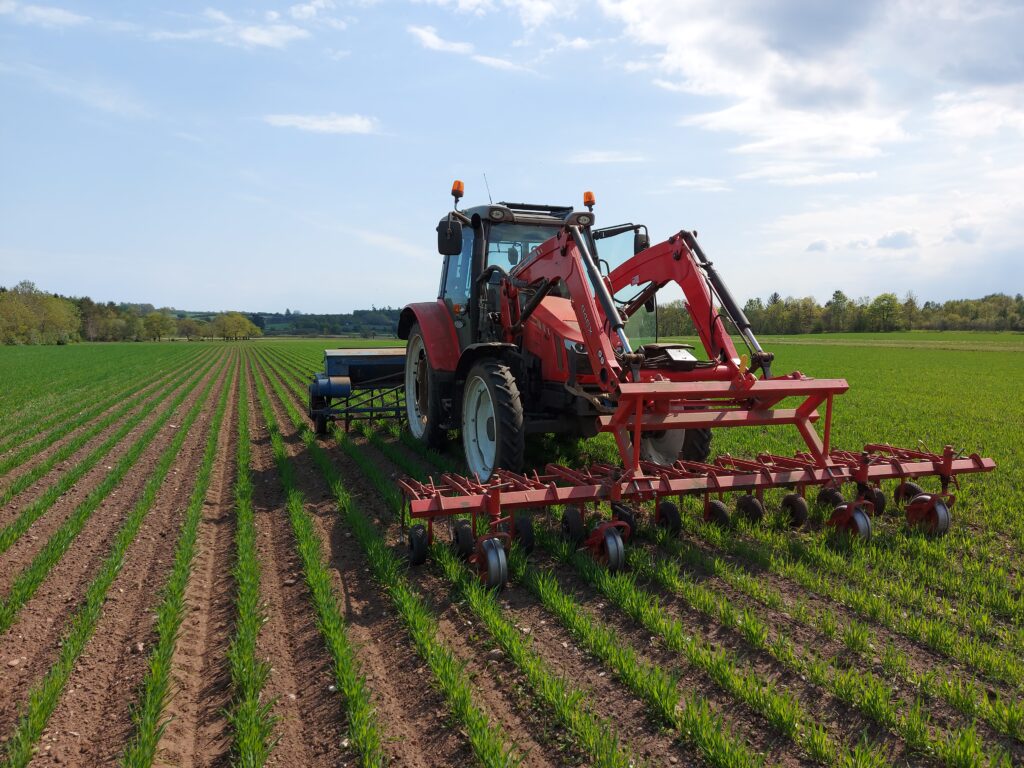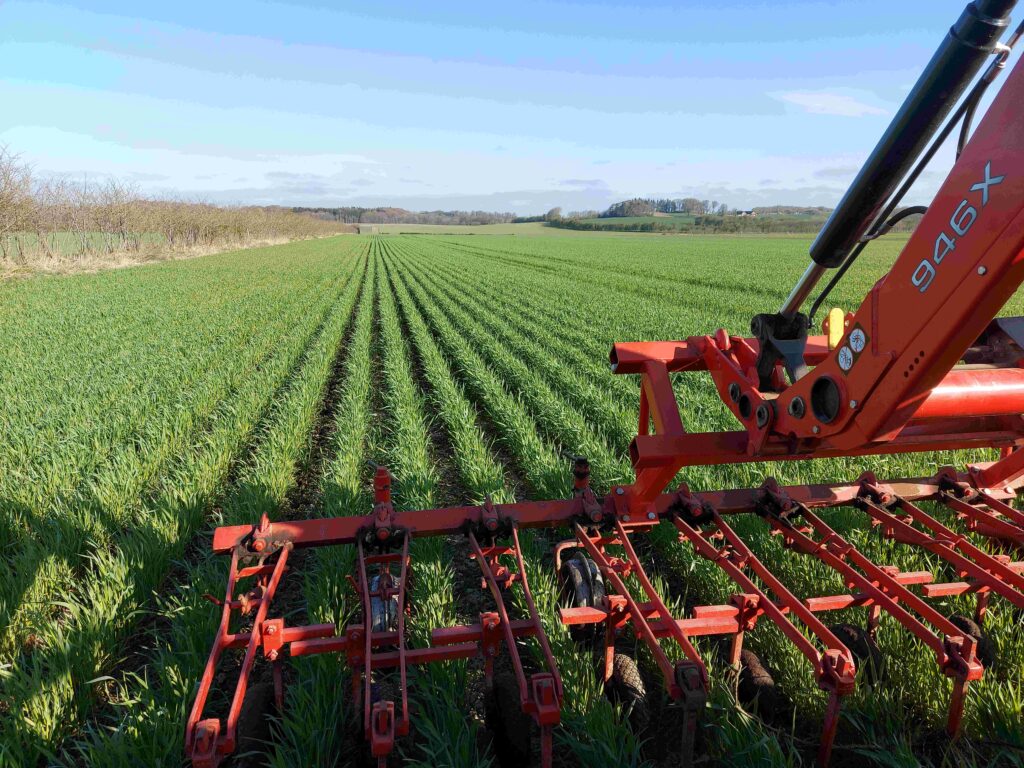 Derimod er vi ved at få succes med at bekæmpe ukrudt og efterafgrøder mellem kornrækkerne. Slåning mellem rækkerne kan potentielt erstatte radrenseren.